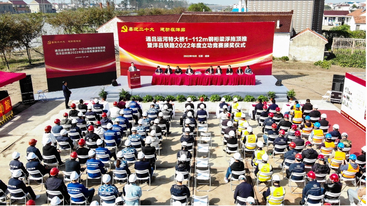 10月9日上午,通呂運河特大橋1-112m鋼桁梁浮托頂推暨洋呂鐵路2022年度立功競賽頒獎儀式在啟東通呂運河畔順利舉辦。